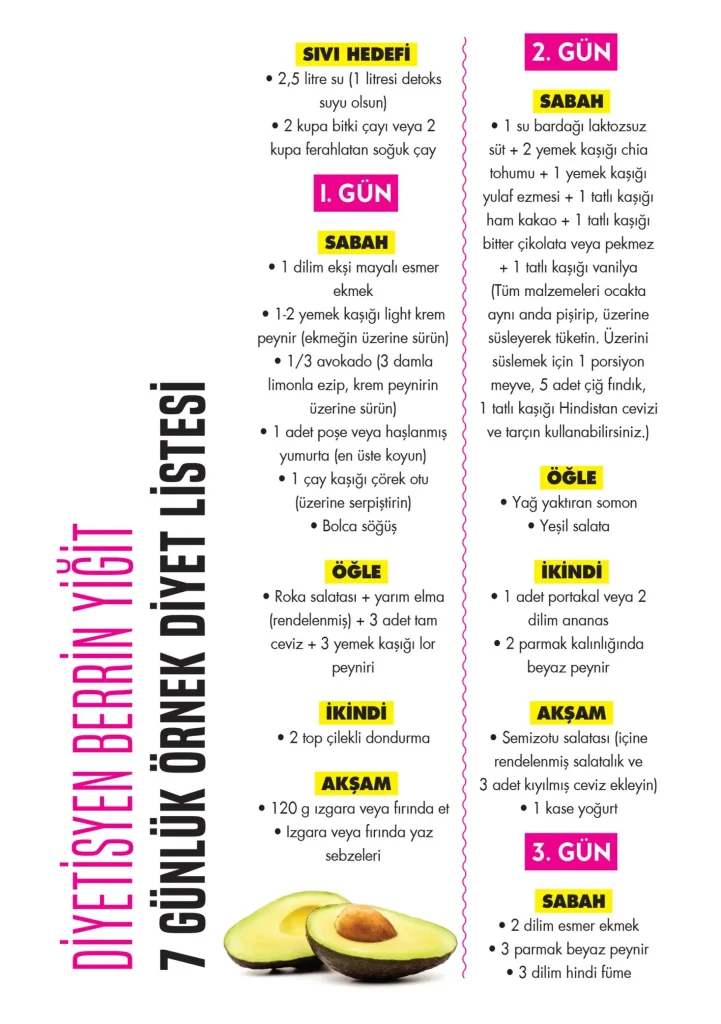 | Gün 1 | Su, sabah ritmi ve kahvaltı | Su tüketimini 2-2,5 litreye hedefleyin; sabah hafif kahvaltı metabolizmayı canlandırır ve gün içinde enerji sağlar. Protein ve lif açısından zengin kahvaltı, gün boyunca daha az atıştırmaya yardımcı olur. |